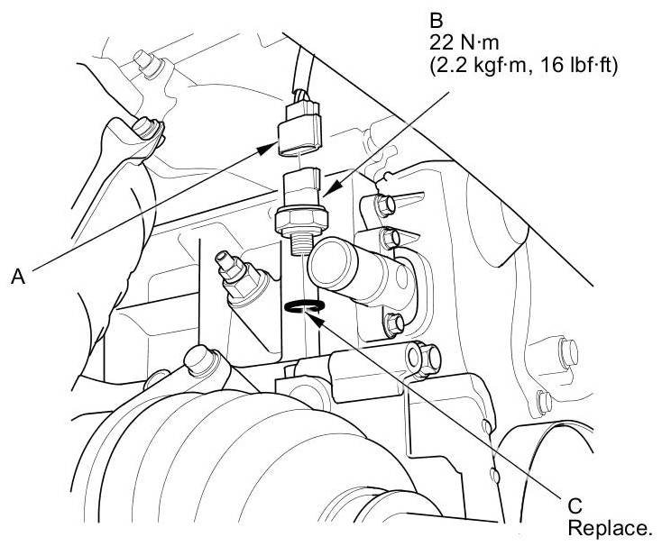 5. Install the rocker arm oil pressure sensor with a new O-ring (C).