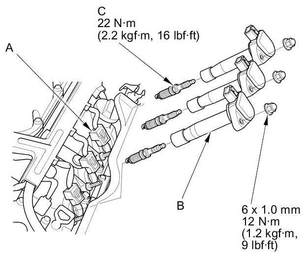 3. Remove the spark plugs (C) and inspect them Testing and Inspection.
