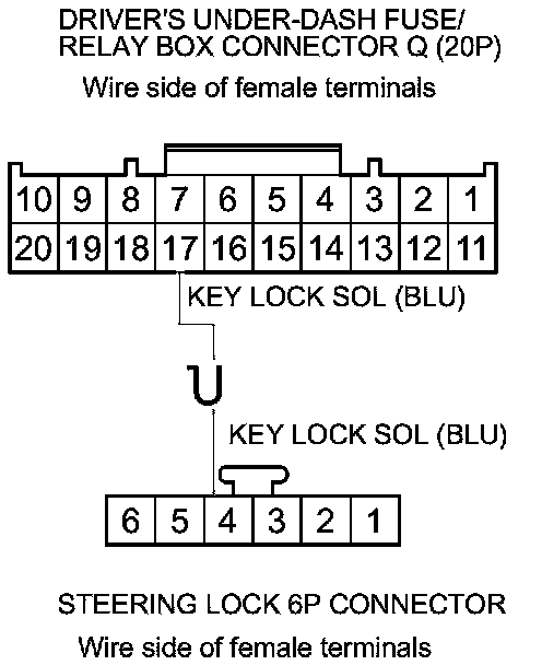 11. Check for continuity between driver's under-dash fuse/relay box connector Q (20P) terminal No. 17 and steering lock 6P connector terminal No. 4.