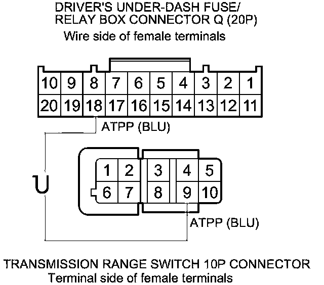 20. Check for continuity between driver's under-dash fuse/relay box connector Q (20P) terminal No. 18 and transmission range switch 10P connector terminal No. 9.