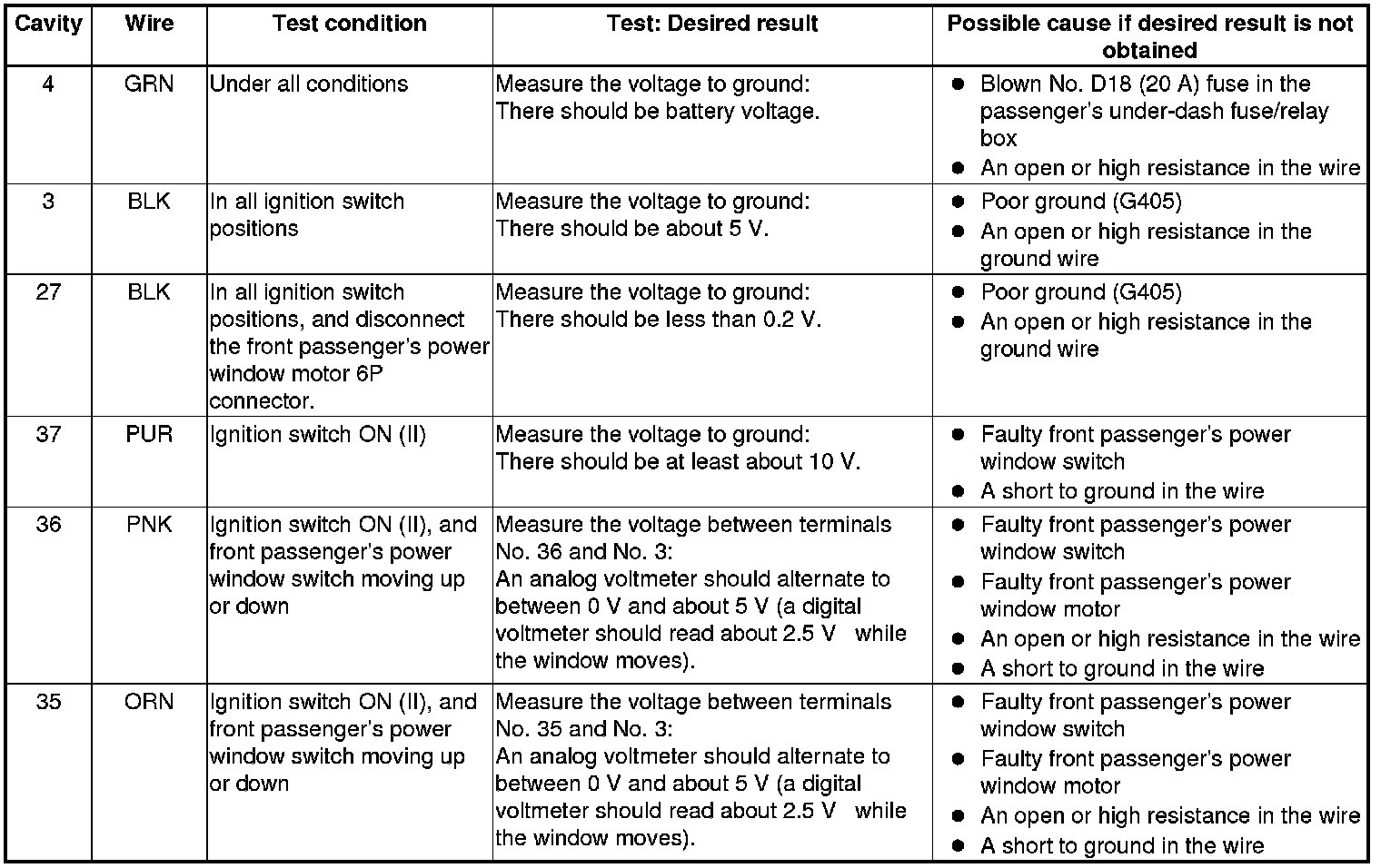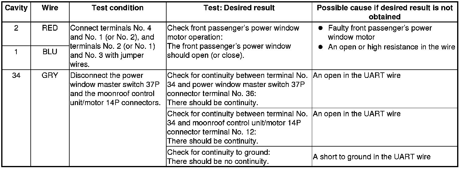 5. Reconnect the connector to the front passenger's power window switch, and do the following input tests: