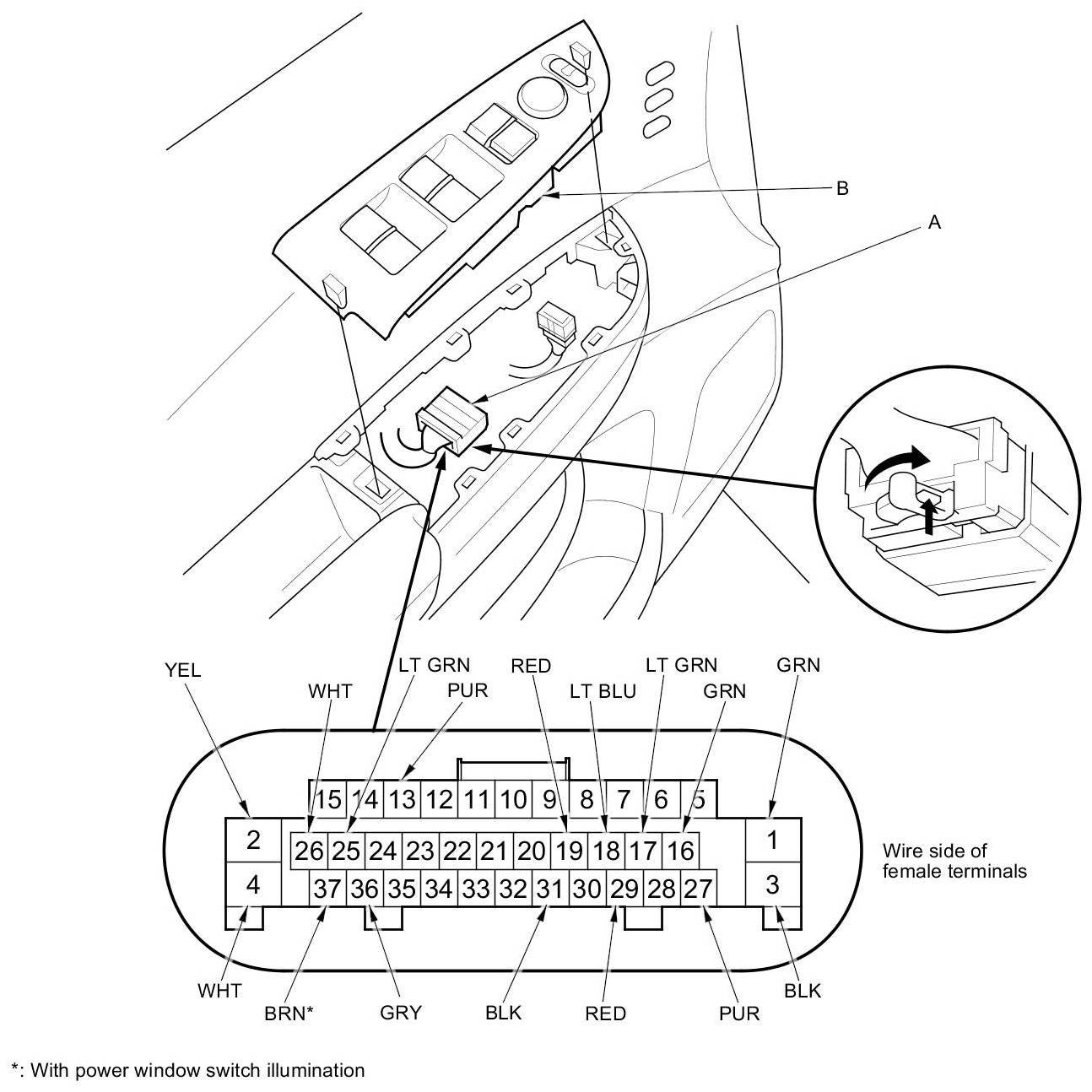 3. Disconnect the 37P connector (A) from the power window master switch (B).