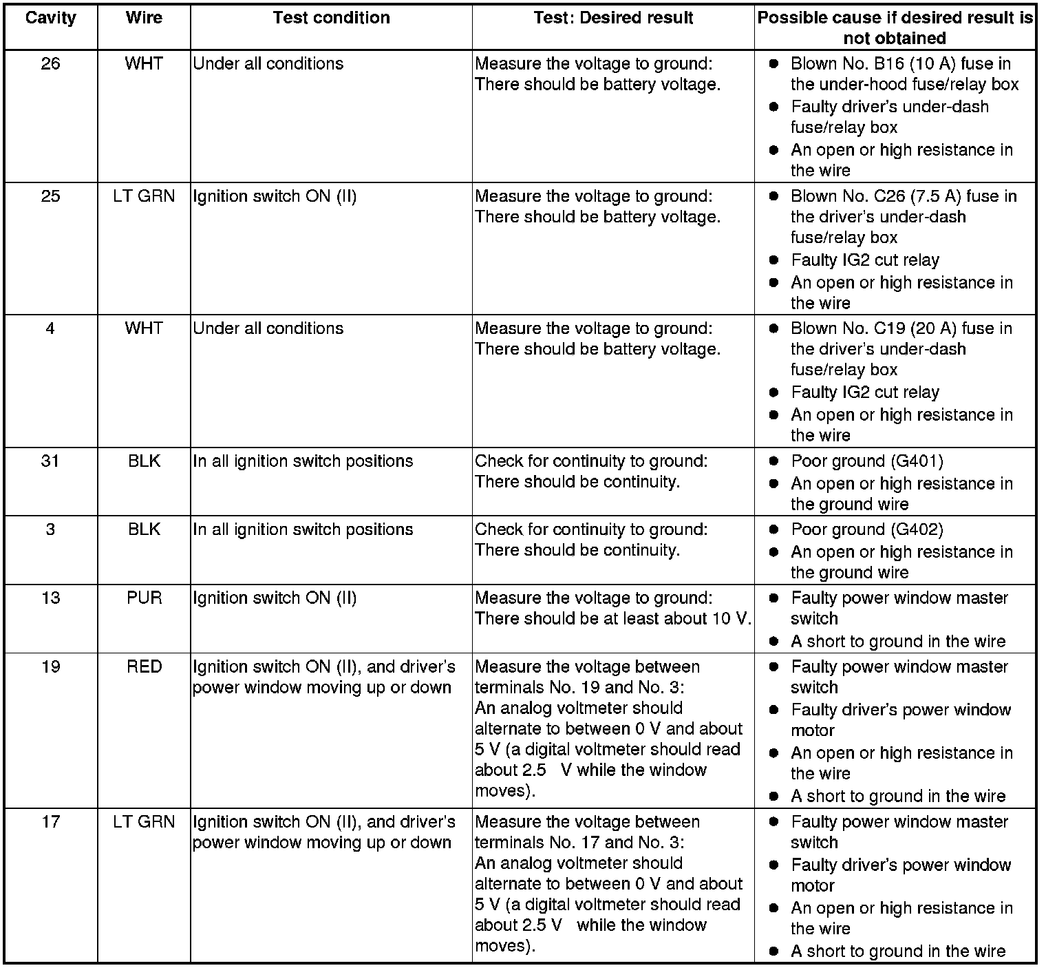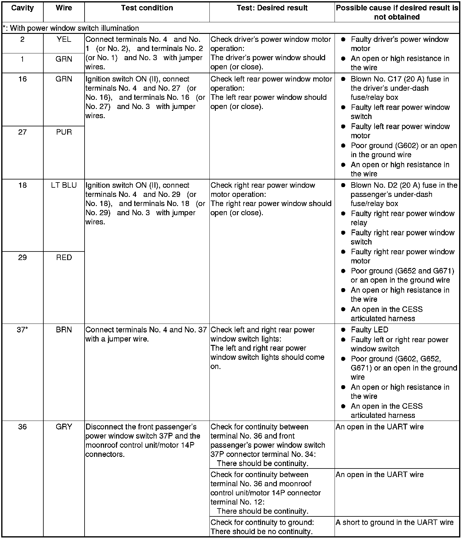5. Reconnect the connector to the power window master switch, turn the ignition switch to ON (II), and do the following input tests: