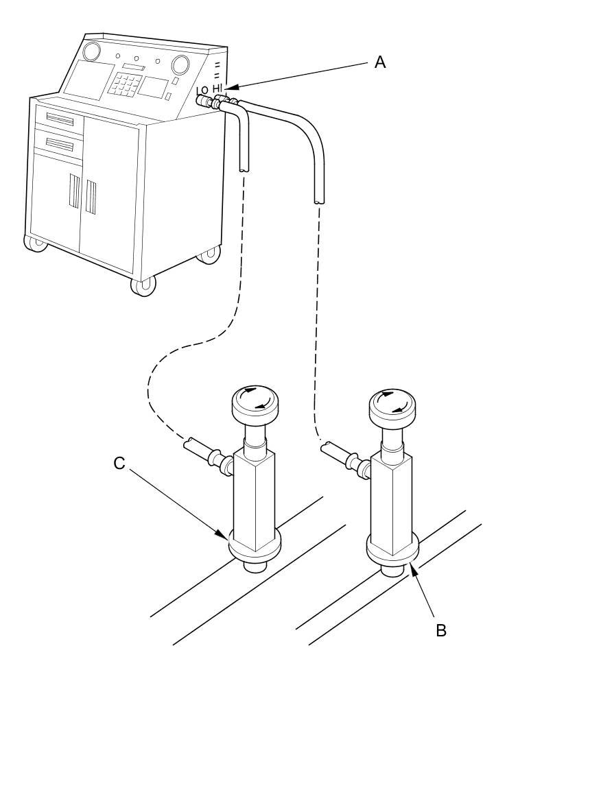 1. Connect an R-134a refrigerant recovery/recycling/charging station (A) to the high-pressure service port (B) and the low-pressure service port (C), as shown, following the equipment manufacturer's instructions.