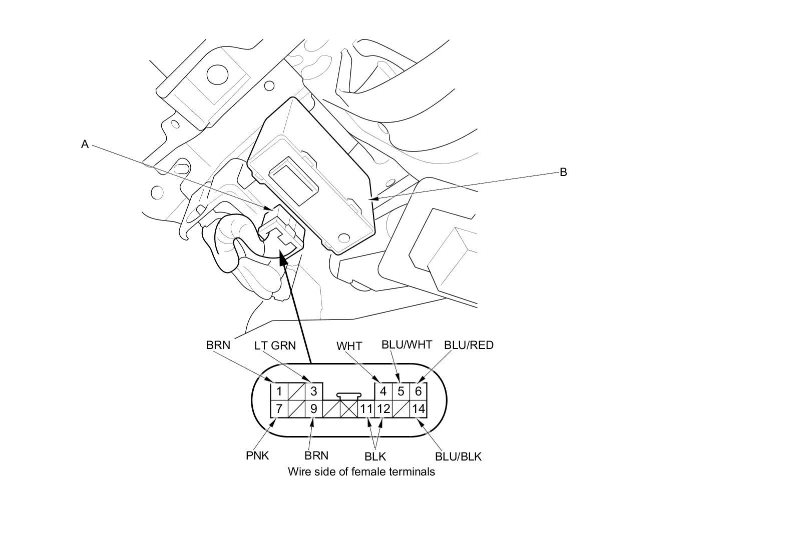 2. Disconnect the 14P connector (A) from the automatic lighting control unit (B).