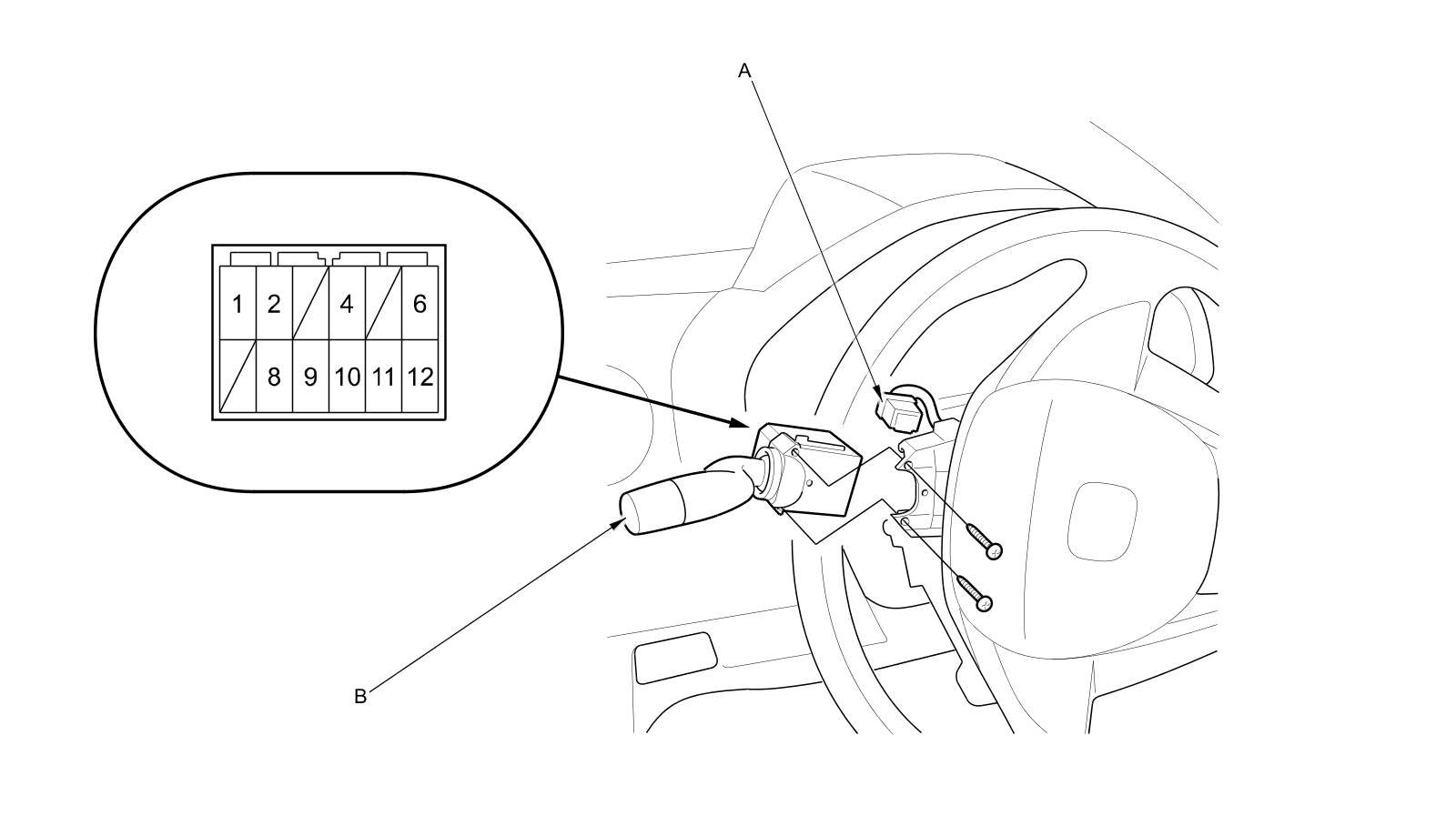 2. Disconnect the 12P connector (A) from the combination light switch (B).