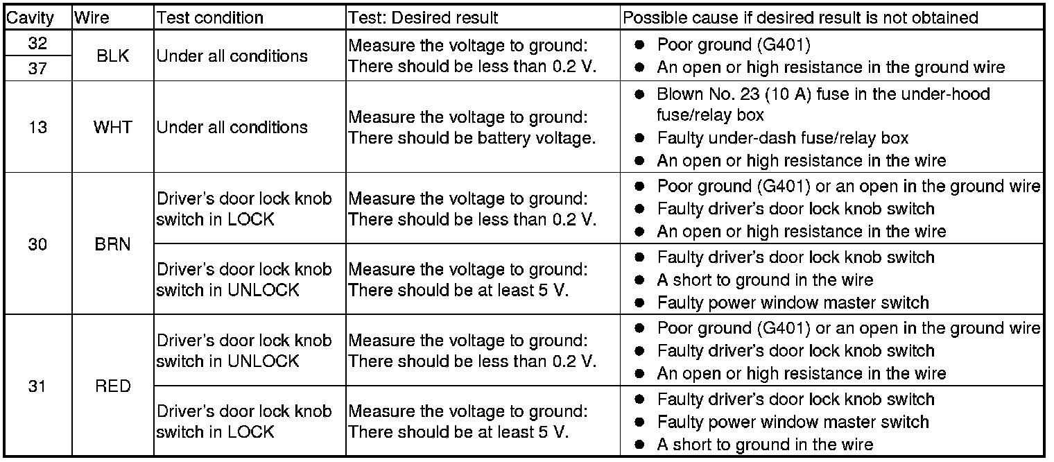 10. Reconnect the 37P connector to the power window master switch, and do the following input tests.