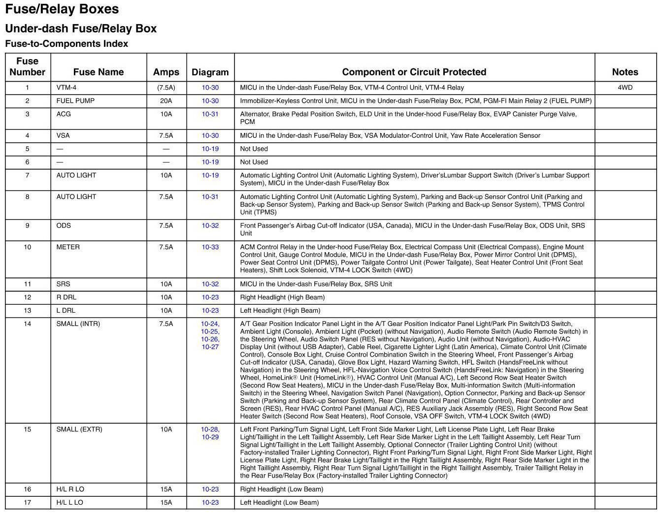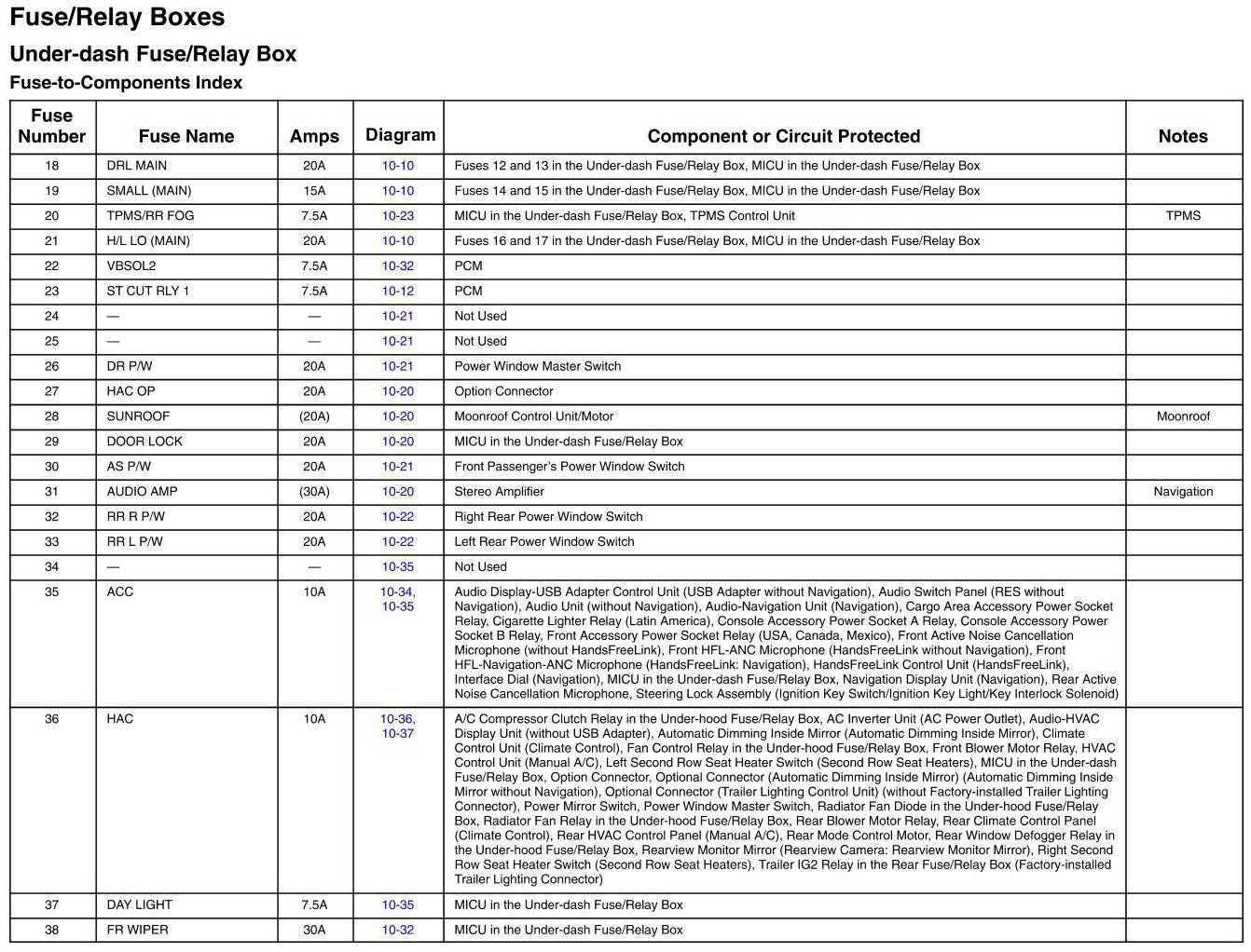 Under-Dash Fuse/Relay Box - Fuse-to-Components Index