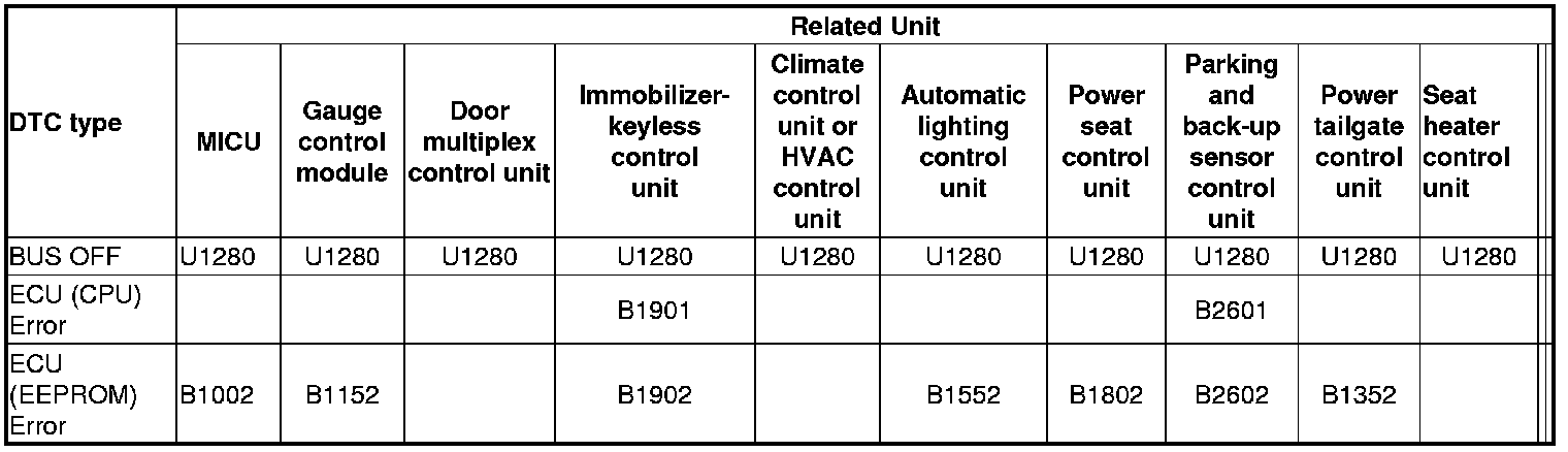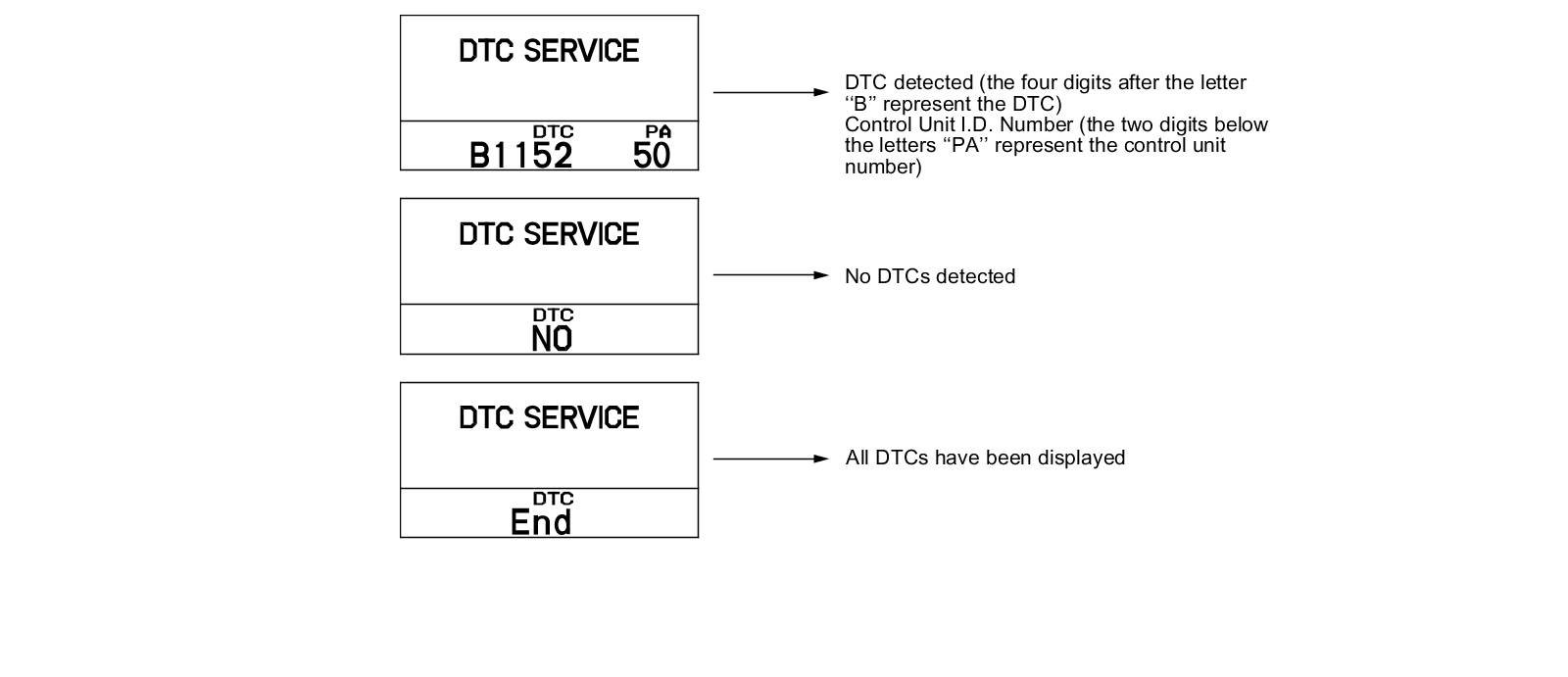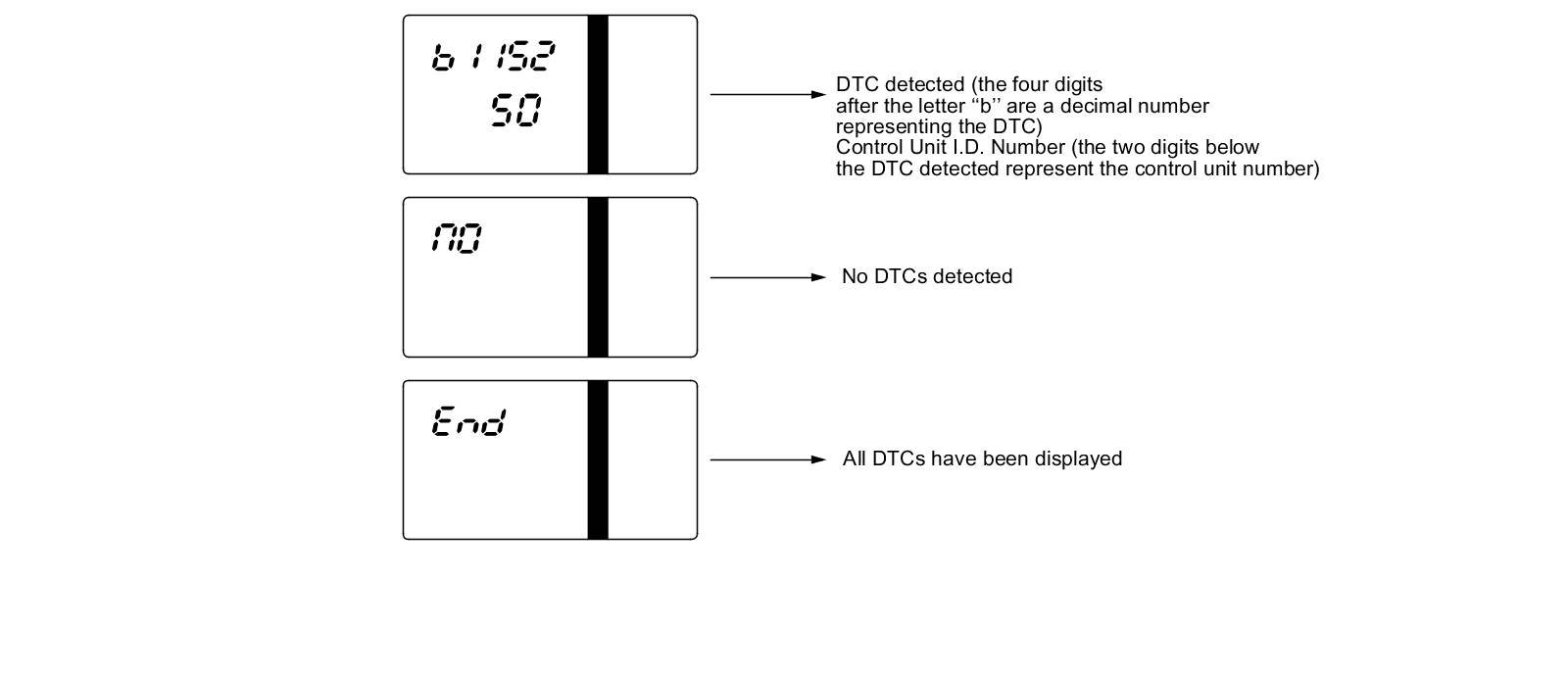 2. While in Test Mode 1, with normal communication between the MICU and gauge control module, the DTCs which have been detected and stored individually by various B-CAN (Body-Controller Area Network) units are shown one by one on the information display or the multi-information display. To scroll through the DTCs, press the SEL/RESET button.