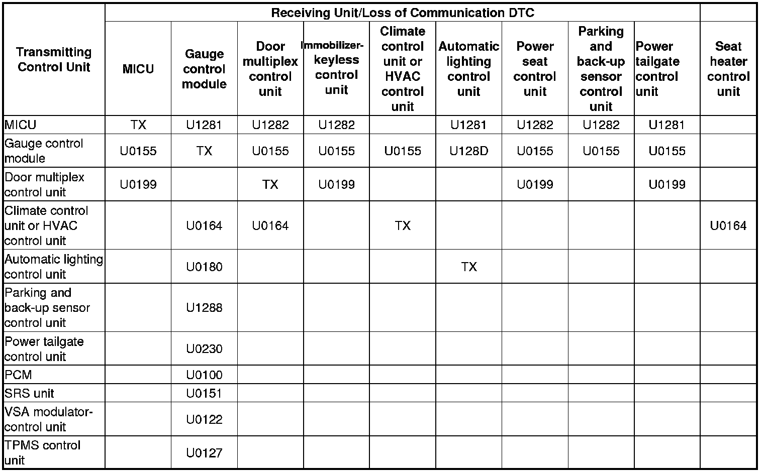 1. Find the Transmitting Control Unit that is in the same row as all of the loss of communication DTCs retrieved.