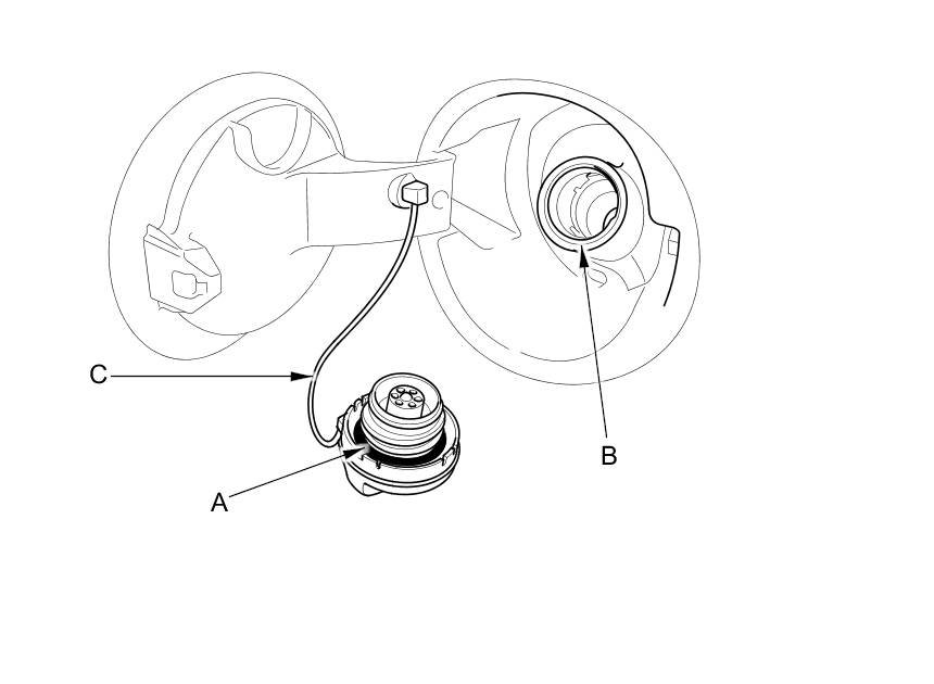 2. Check the fuel fill cap seal (A) and the fuel fill pipe mating surface (B). Verify that the fuel fill cap tether cord (C) is not caught under the cap.
