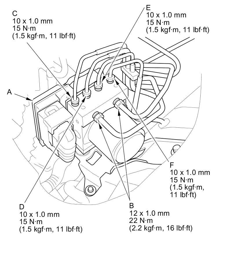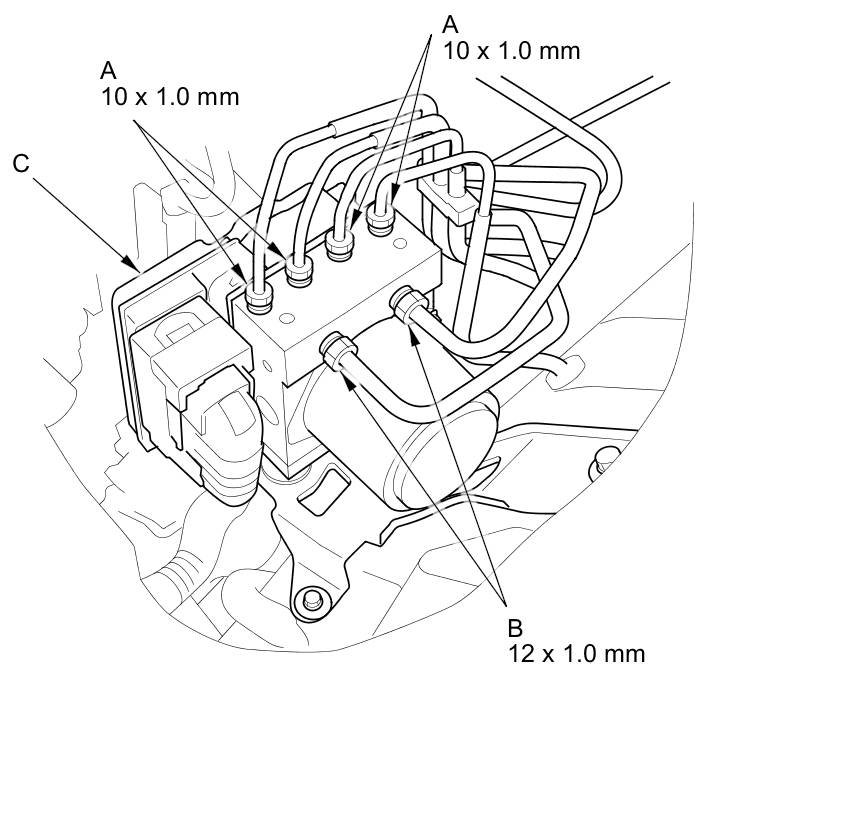 3. Disconnect the 10 mm brake lines (A) and the 12 mm brake lines (B) from the VSA modulator-control unit (C).