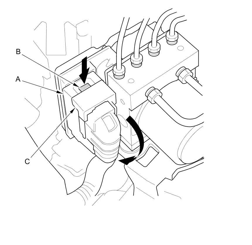 4. Disconnect the VSA modulator-control unit 36P connector (A) by pushing the lock (B) and pulling down the lever (C); the connector disconnects itself.