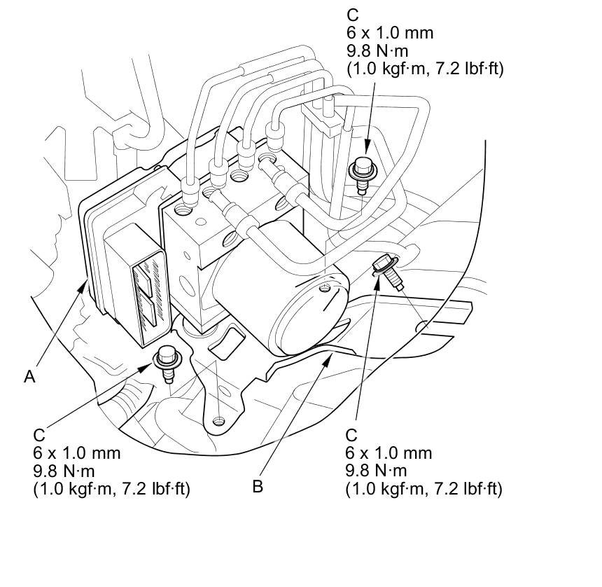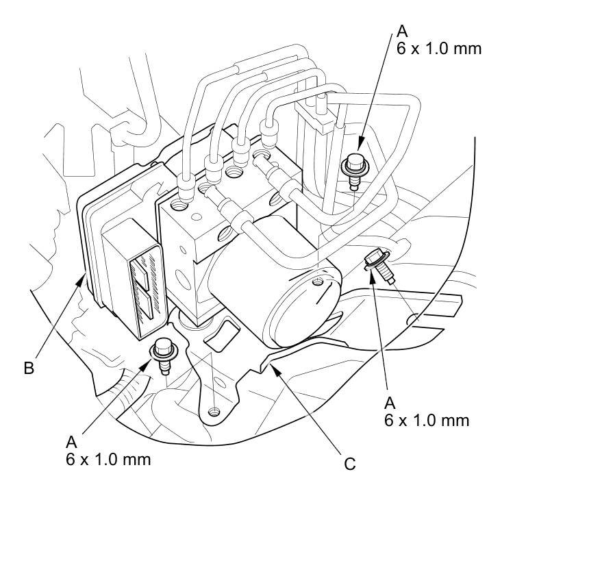 5. Remove the VSA modulator-control unit bracket mounting bolts (A), then remove the VSA modulator-control unit (B) with the bracket (C) from the body.