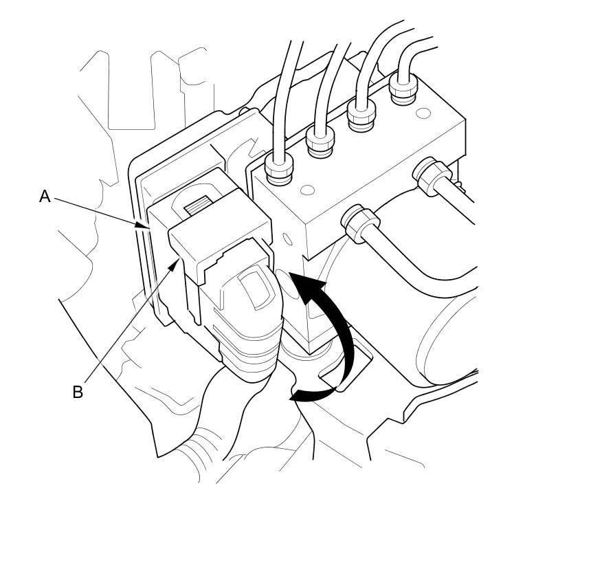 4. Pull up the lever (B) of the VSA modulator-control unit 36P connector, then confirm the connector is fully seated.