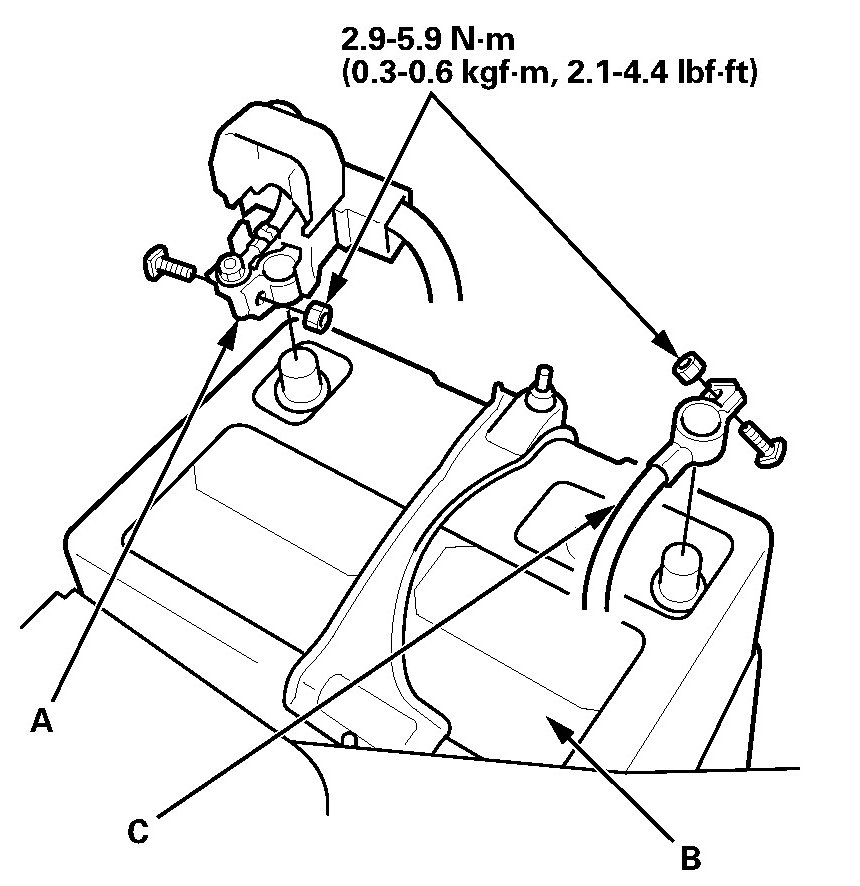 3. Reconnect the positive cable (A) to the battery (B) first, then reconnect the negative cable (C) to the battery.