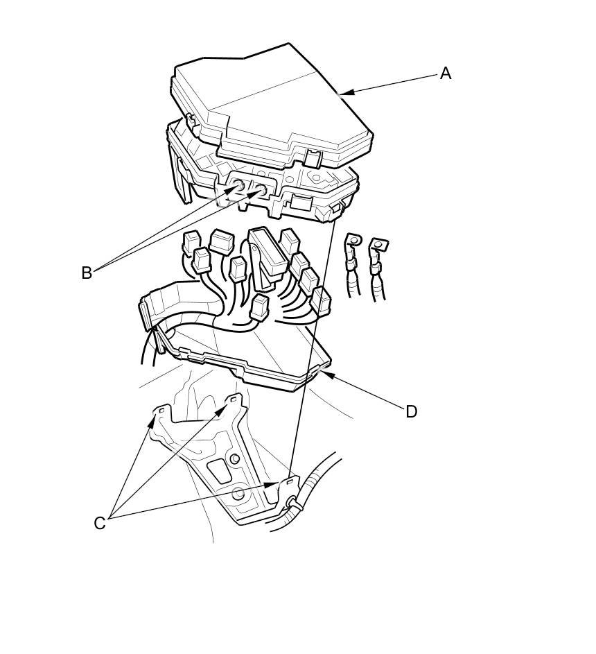 3. Release the tabs (C), and then remove the bottom cover (D) from the under-hood fuse/relay box.