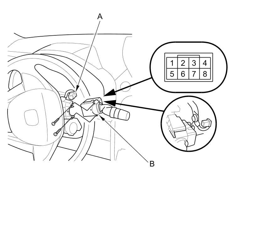 2. Disconnect the dashboard wire harness 8P connector (A) from the wiper/washer switch (B).