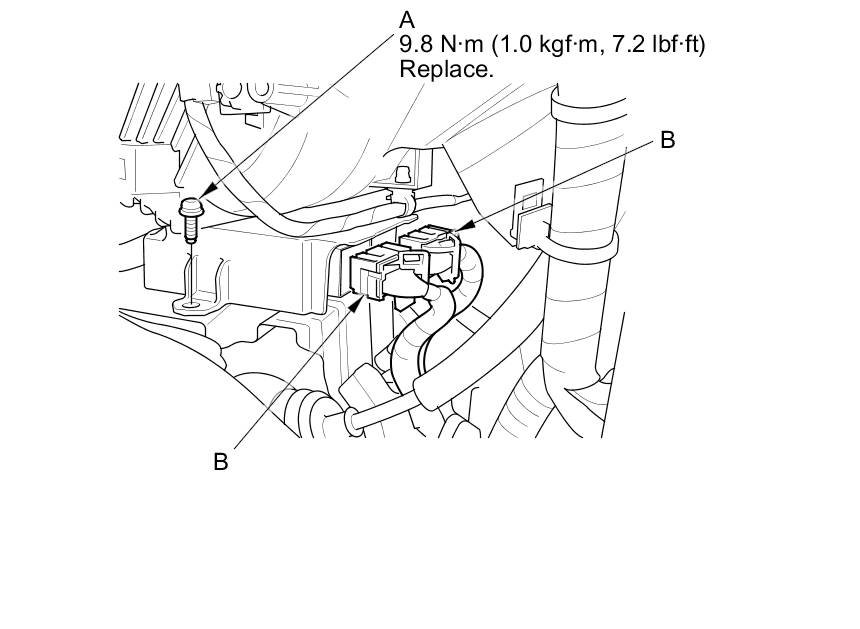 2. Install the new TORX bolt (A), using a TORX T30 bit, then connect the connectors (B) to the SRS unit; push them into position until they click.