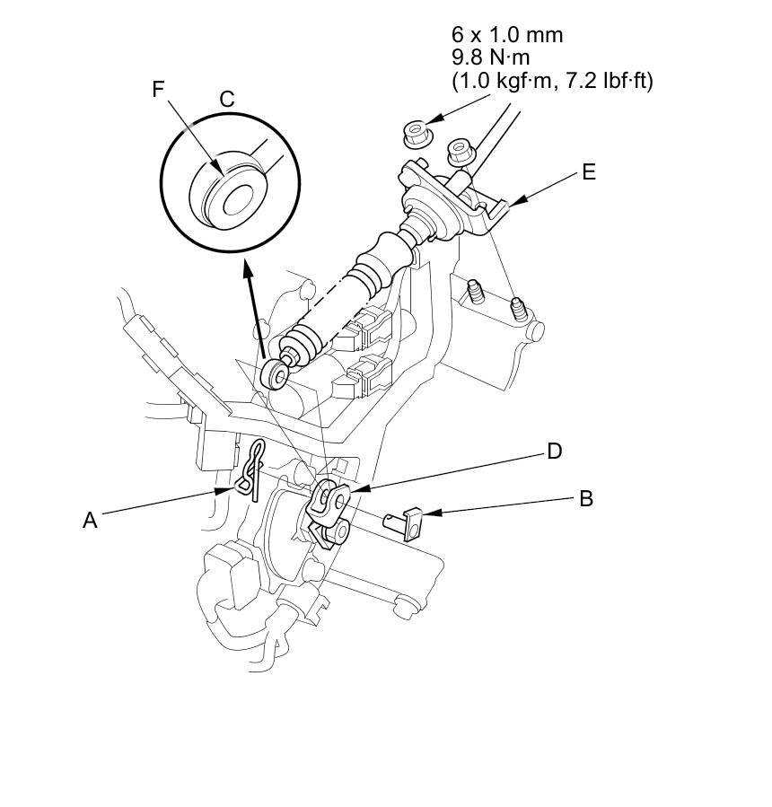 8. Check the bushing (F) in the shift cable end for proper fit and wear. If the bushing is loose or worn, replace the shift cable Service and Repair.