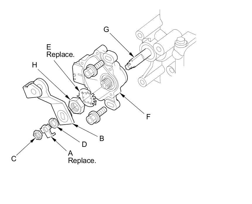 11. Pry the lock tabs of the lock washer (E) on the transmission range switch (F), hold the selector control shaft (G) with a 6.0 mm wrench, and loosen the locknut (H).