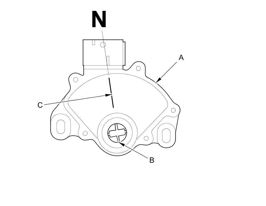 13. Set a new transmission range switch (A) to N. The transmission range switch clicks in N, and the selector control shaft hole (B) aligns with N position line (C).