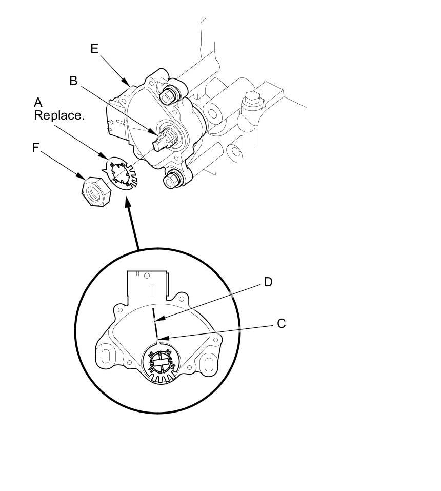 16. Install a new lock washer (A) over the selector control shaft (B) by aligning the indicator tab (C) of the lock washer with the N positioning line (D) on the transmission range switch (E), and install the locknut (F).