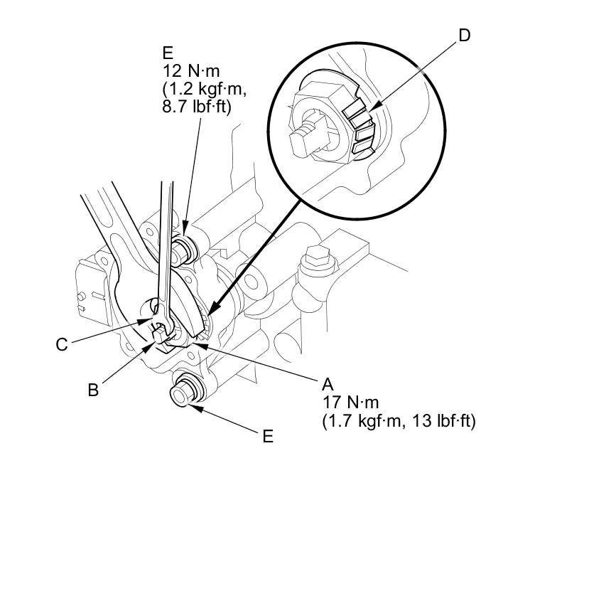 18. Tighten the bolts (E) to 12 Nm (1.2 kg-m, 8.7 lb-ft) securing the transmission range switch.