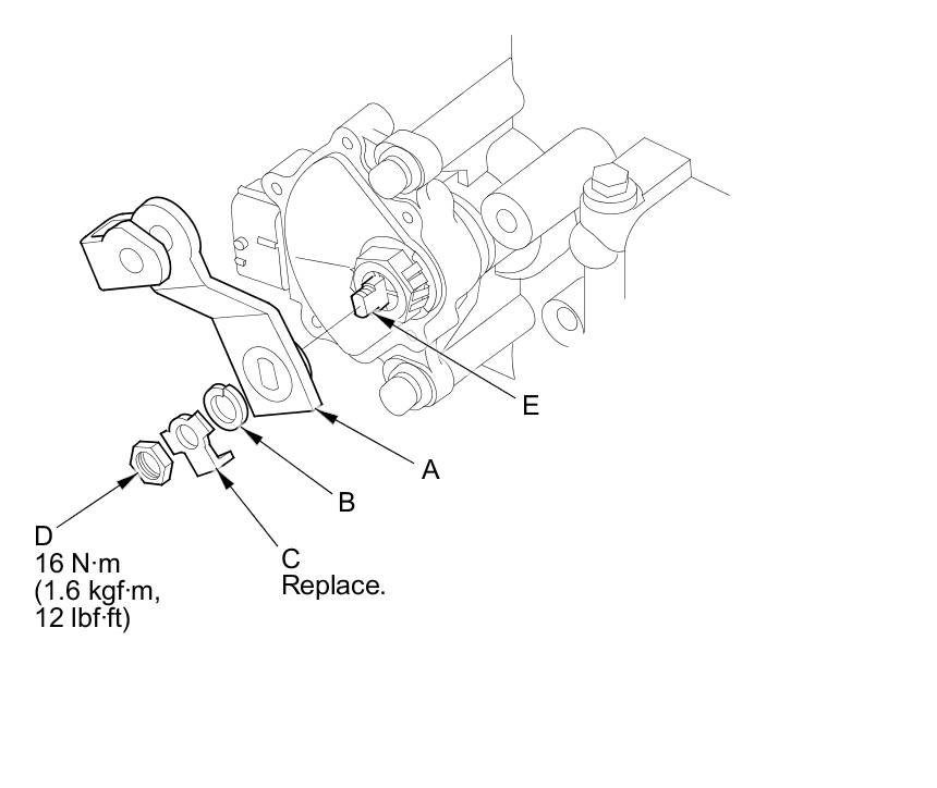 19. Install the selector control lever (A), the spring washer (B), a new lock washer (C), and the locknut (D) on the selector control shaft (E).