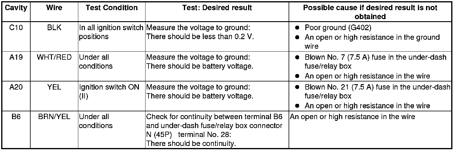 NOTE: Check the No. 22 (120 A), No. 23 (60 A), No. 15 (40 A) fuse in the under-hood fuse/relay box before testing.