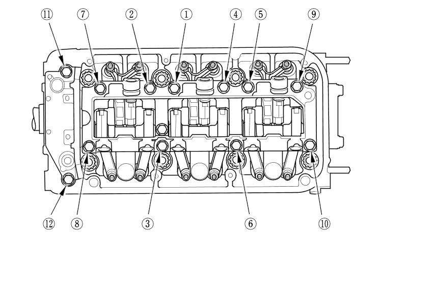 Tighten each bolt two turns at a time in the sequence shown to ensure that the rockers do not bind on the valves.