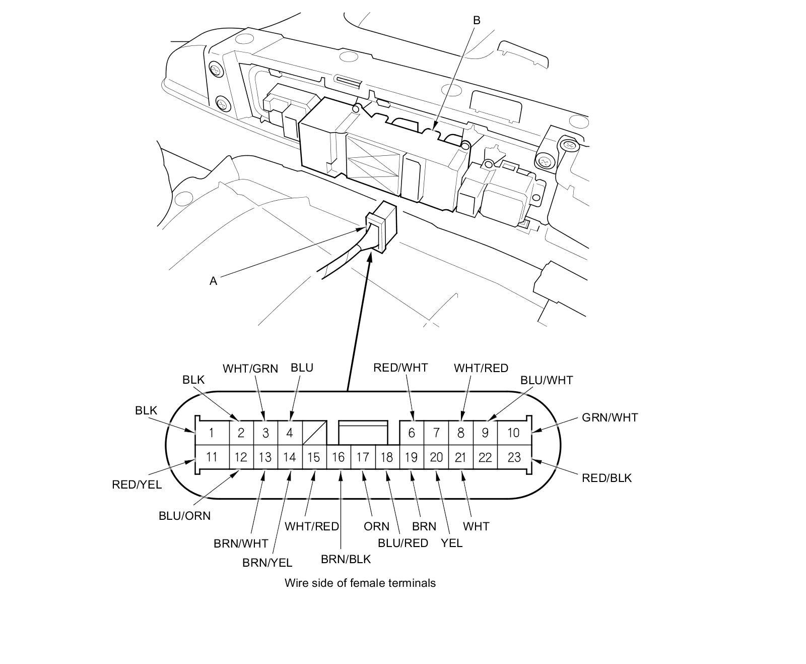 4. Disconnect the 23P connector (A) from the power window master switch (B).