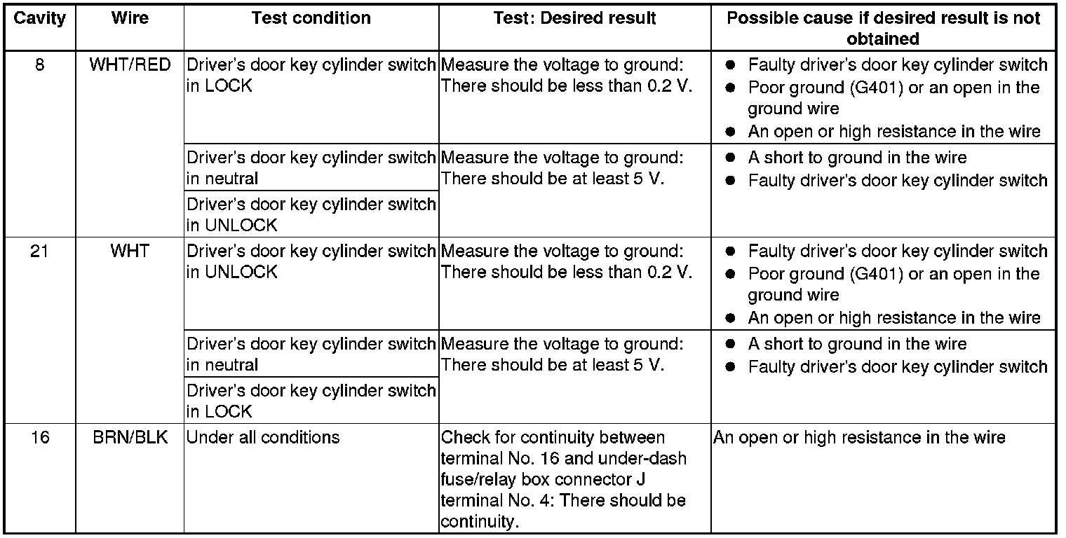7. Reconnect the connector to the power window master switch, turn the ignition switch to ON (II) and do the following input tests: