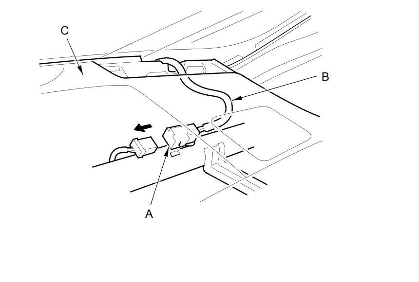 3. Disconnect the windshield defogger connector (A) through the glove box opening, and pull out the windshield defogger harness (B) from the tweeter grille opening in the dashboard (C).