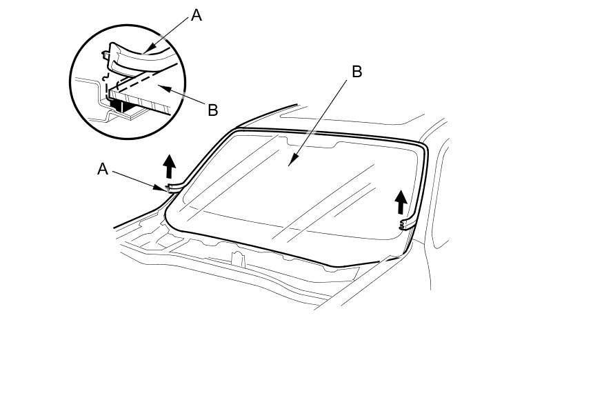 4. Remove the molding (A) from the edge of the windshield (B). If necessary, cut the molding with a utility knife.