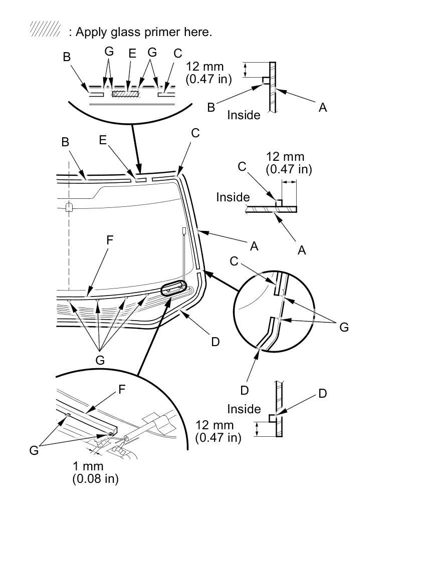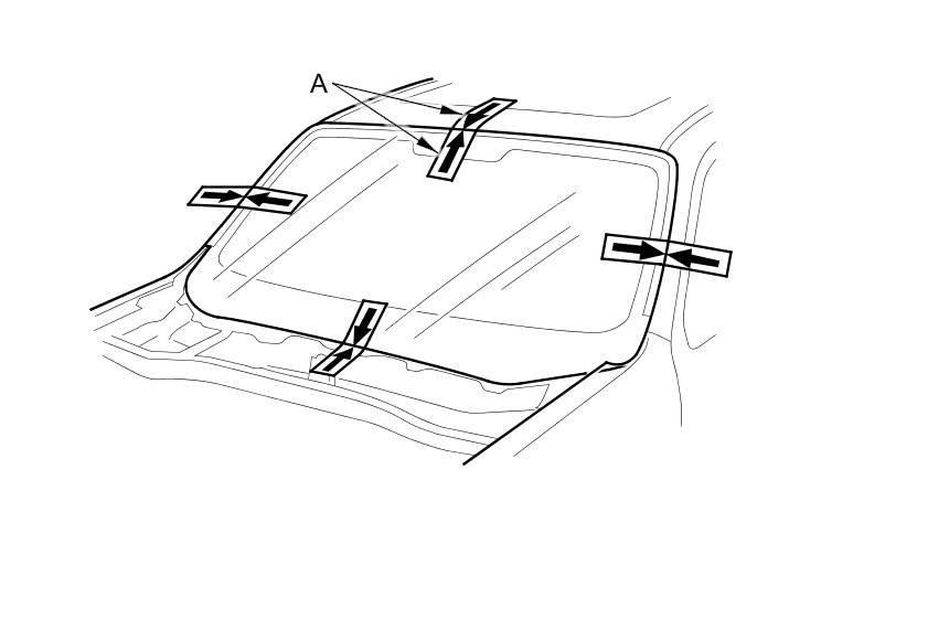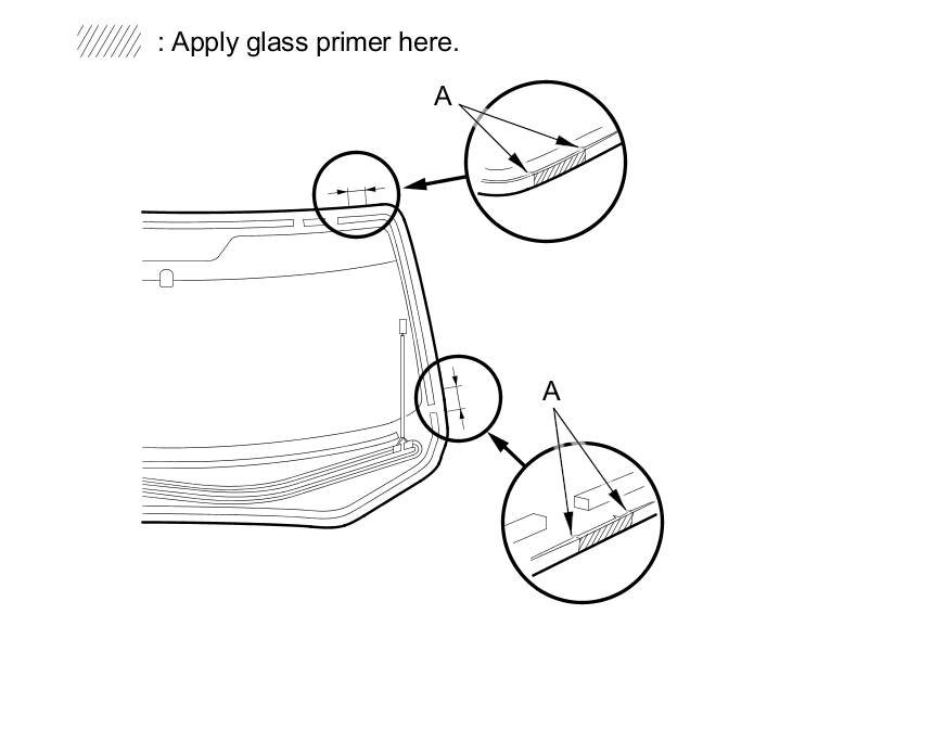 14. Apply glass primer to the edge of the windshield between the alignment marks (A). Be careful not to touch the windshield where adhesive will be applied.