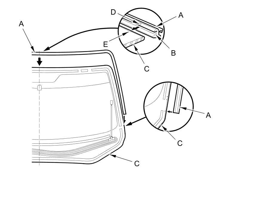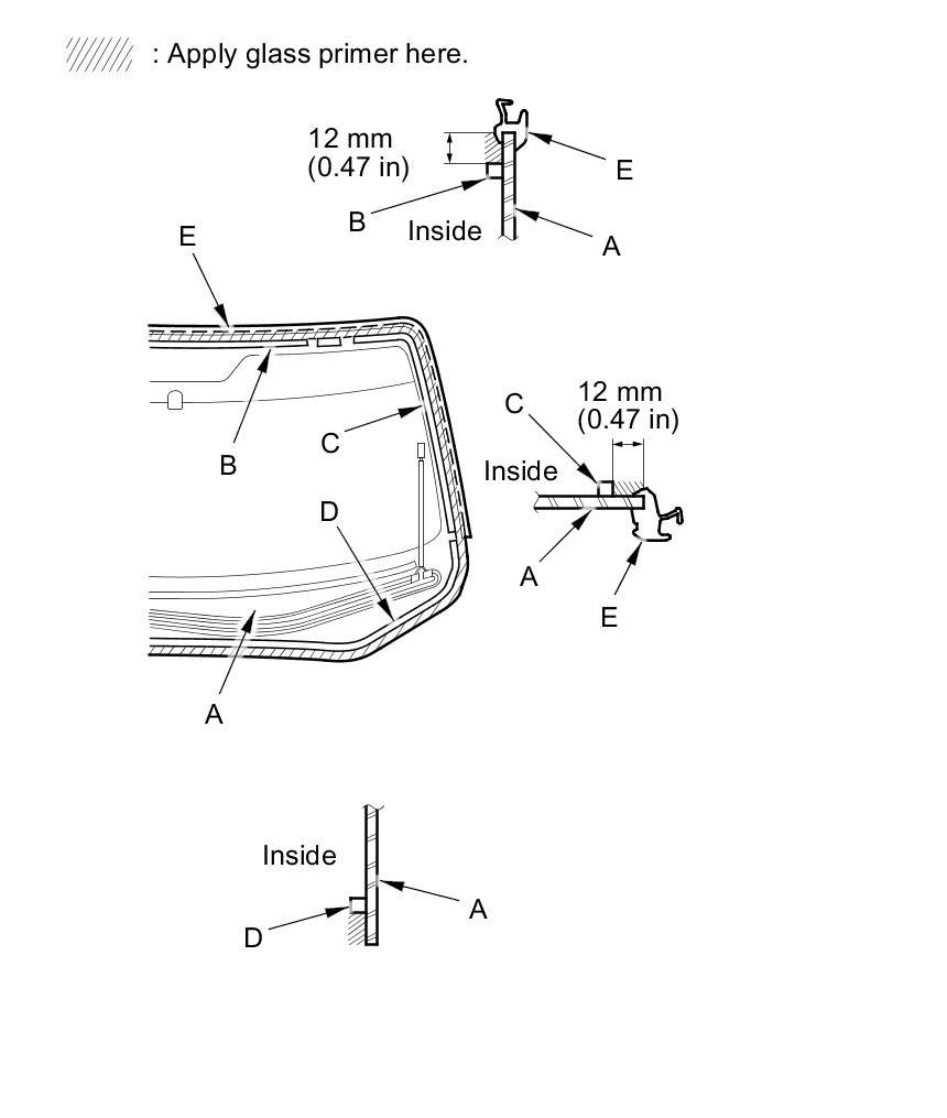 20. Apply a light coat of glass primer to the windshield (A) along the edge of the upper rubber dam (B), the side rubber dams (C), the lower rubber dam (D), and the molding (E) as shown, then lightly wipe it off with gauze or cheesecloth: