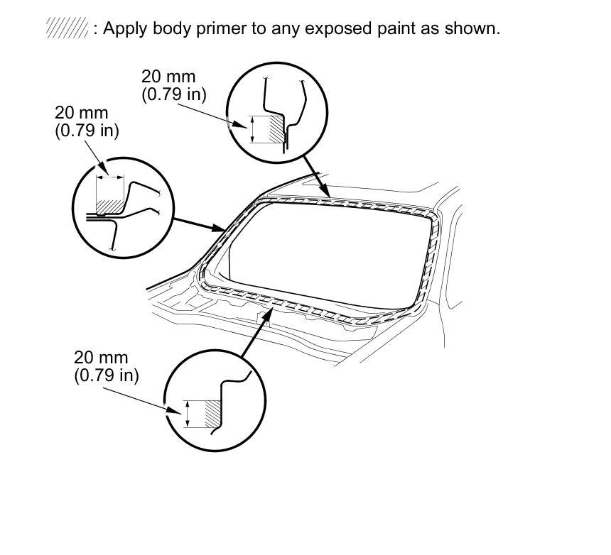 - Never touch the primed surfaces with your hands. If you do, the adhesive may not bond to the windshield properly, causing a leak after the windshield is installed.