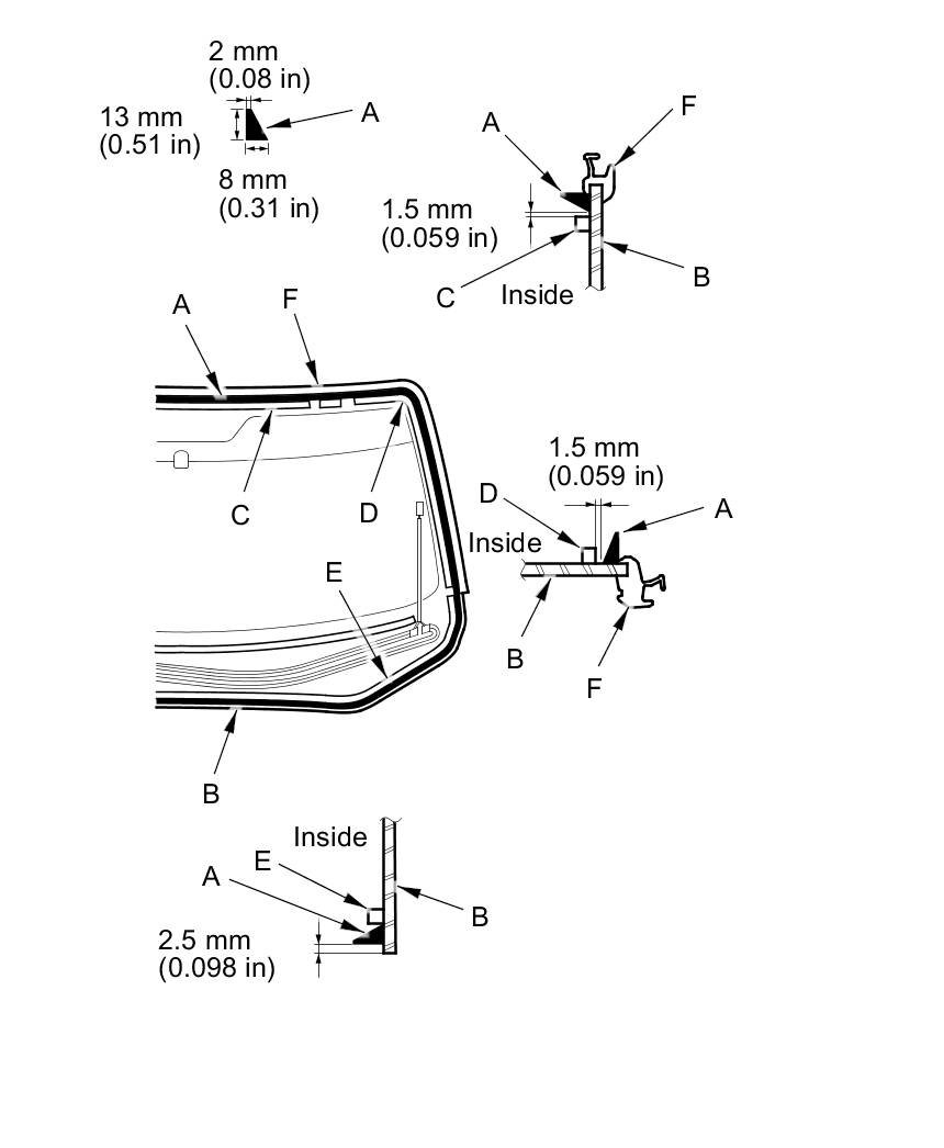 13. Apply glass primer to the fastener mounting area on the windshield (A), and let it dry. Remove the adhesive backing and attach the upper rubber dam (B), the side rubber dams (C), the lower rubber dam (D), the fasteners (E), and the dashboard seal (F) to the inside face of the windshield as shown.