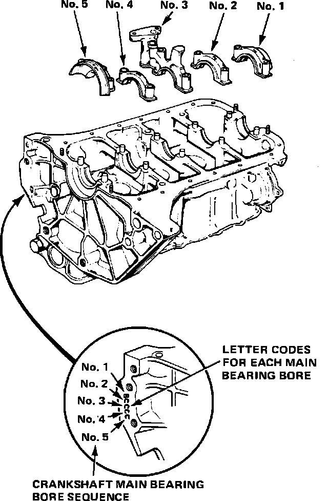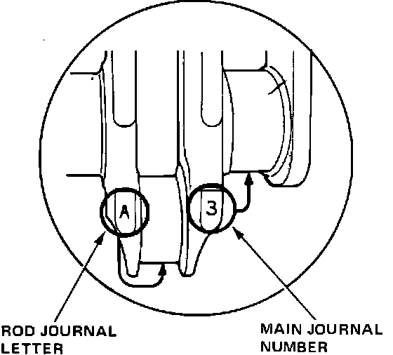 Different sizes of main bearings may be present in the same engine. To find the correct bearing size for each journal, use the provided chart to properly reference the code markings on block and crankshaft.