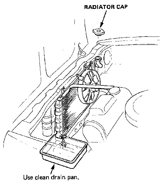 7. Drain coolant from radiator and engine block into a clean pan so it may be re-used. Remove radiator cap to speed draining.