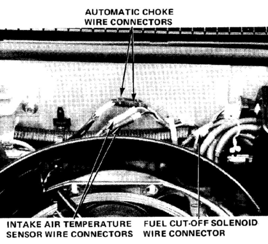 15. Disconnect the intake air temperature sensor wire connectors, automatic choke wire connectors and fuel cut-off solenoid wire connector.