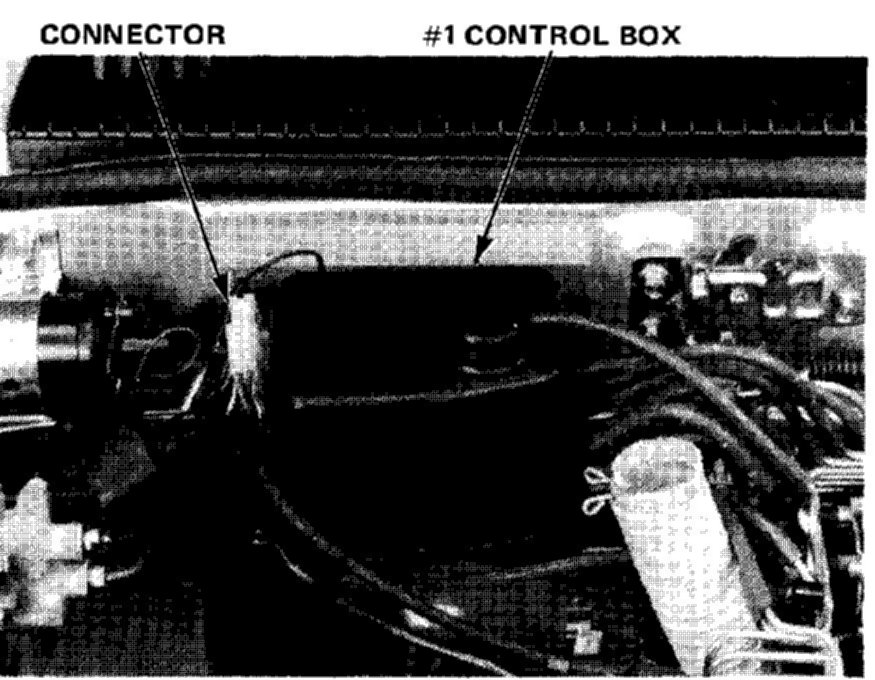 22. Disconnect the # 1 control box connector. Lift the control box off its bracket, and let it hang next to the engine.
