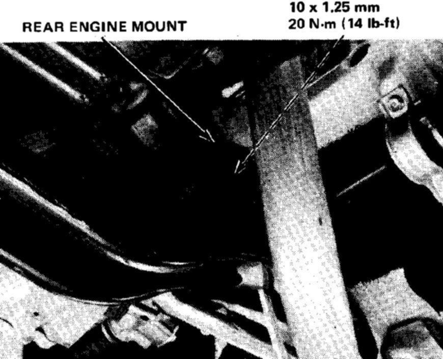 45. Remove bolt from rear torque rod at engine, then loosen bolt in frame mount and swing rod up out of the way.