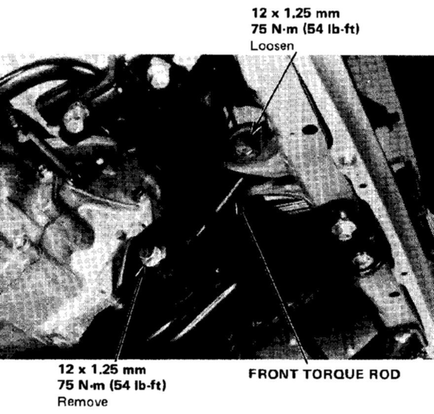 44. Remove bolt from front torque rod at engine, then loosen bolt in frame mount and swing rod down out of the way.