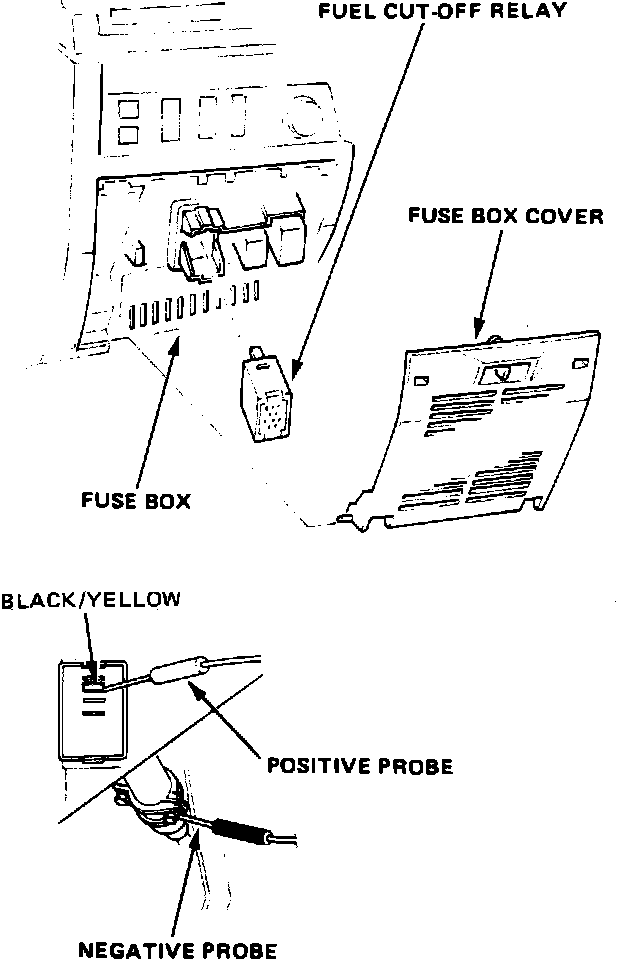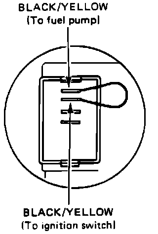4. With ignition switch off, disconnect fuel pump cut-off relay from harness connector. Connect the two Black/Yellow wires together with a jumper wire. Turn ignition ON and check for fuel pump operation.