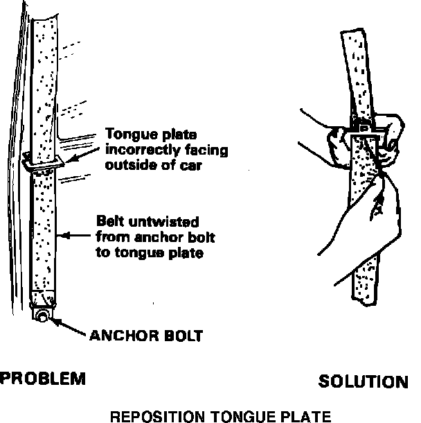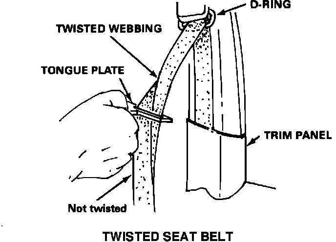 1. If the belt is twisted between the tongue plate and the D-ring, orient the webbing so that the tongue plate is facing the inside of the car and the webbing below the buckle is not twisted.