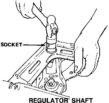 3. Turn the regulator shaft with the window crank until the sector gear disengages from the rack. Select a socket that clears the sides of the main pivoting rivet, support the underside of the regulator, then tap the socket to loosen the pivot.
