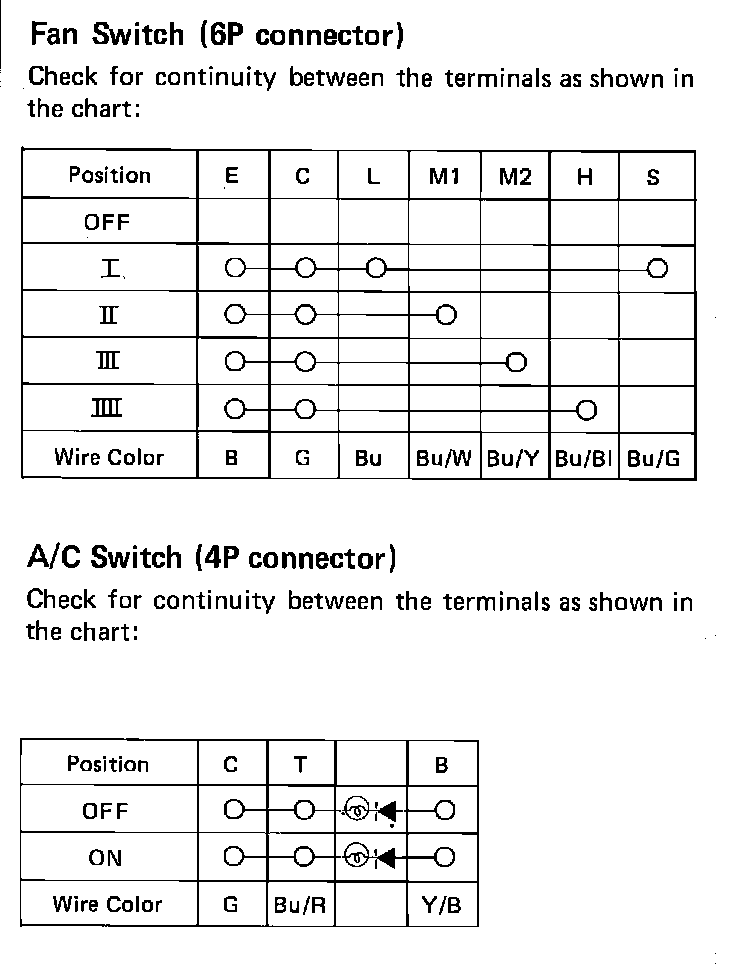 Using a suitable ohmmeter, check for continuity between terminals as shown in chart,