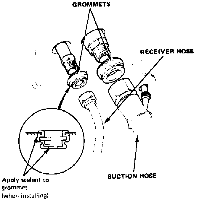 - Apply sealant to the inside and outside mating surfaces of the receiver line and suction hose grommets.